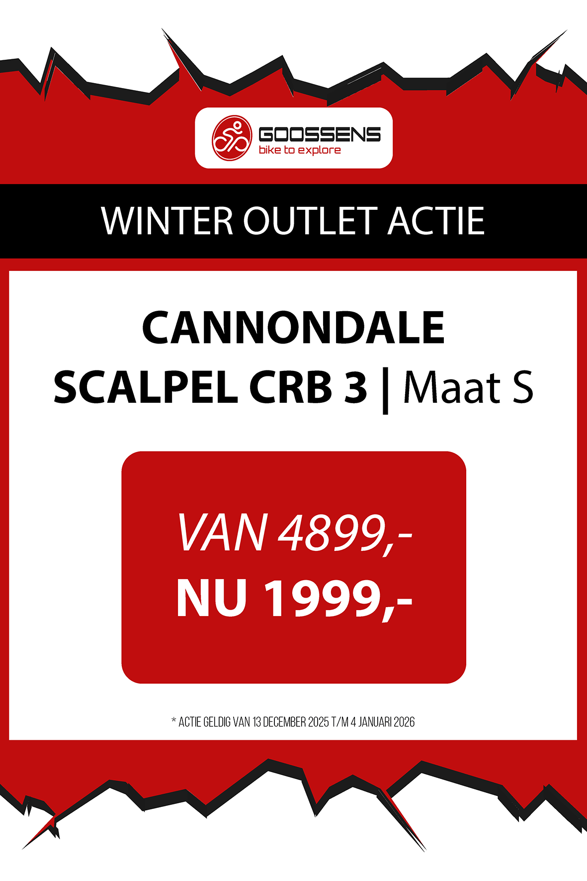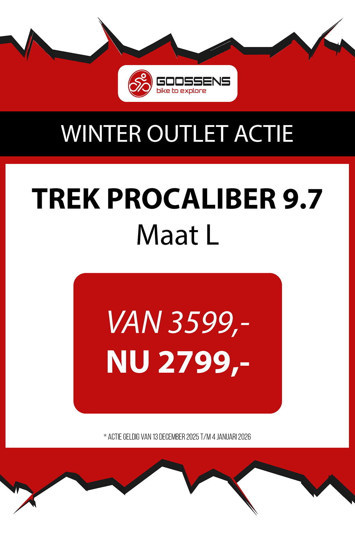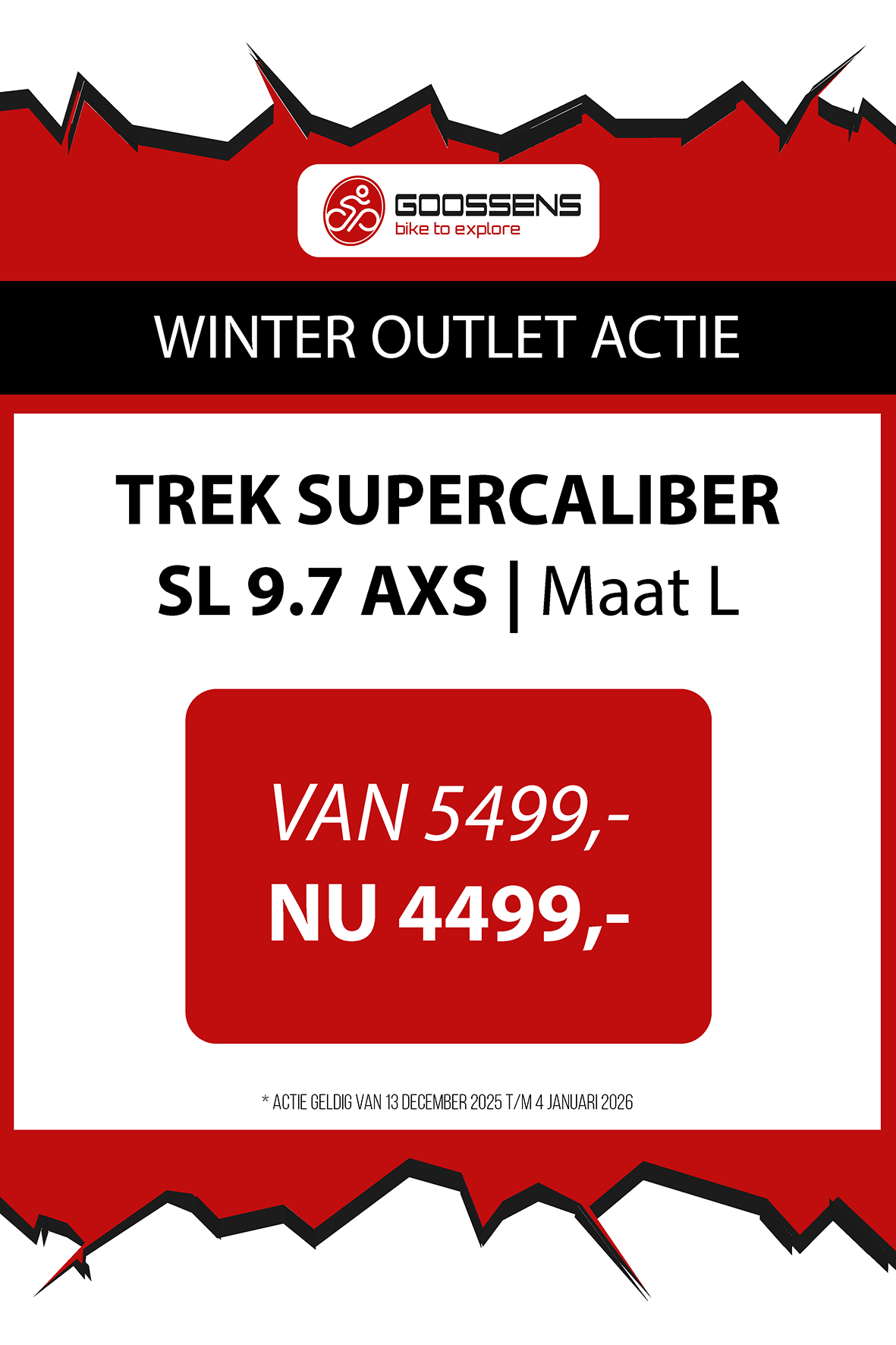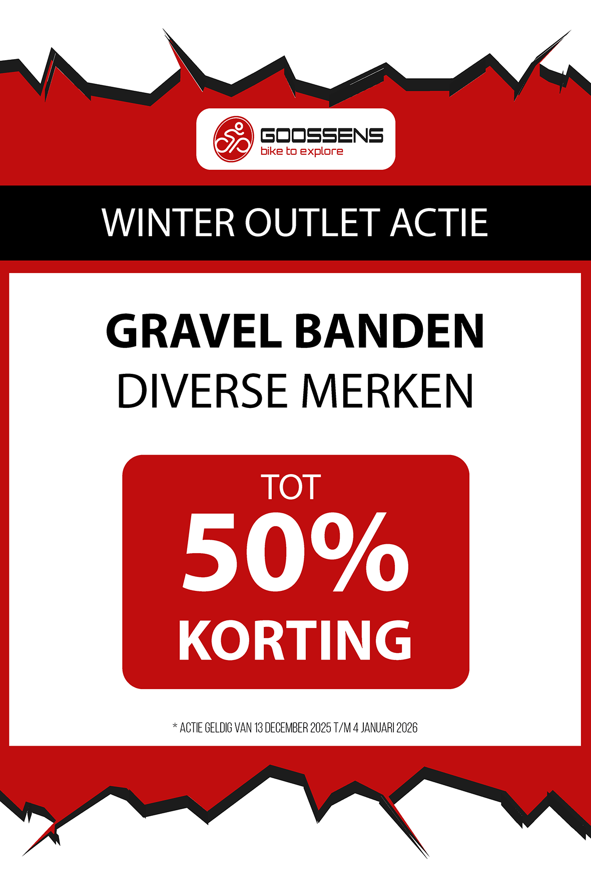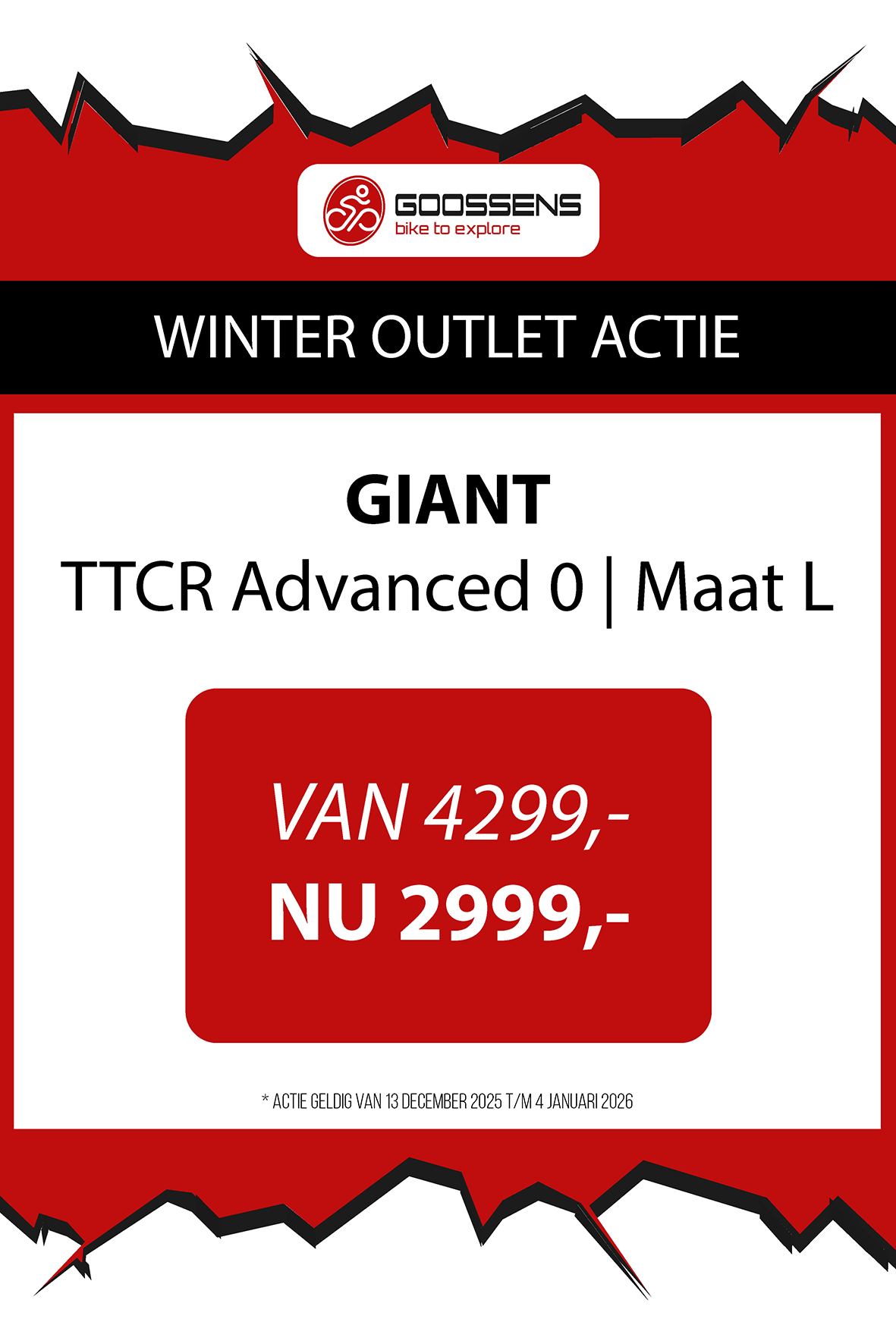 WINTER OUTLET GOOSSENS! Posted on , by in Nieuws Goed nieuws voor de fietsliefhebbers: de Winter Outlet van Goossens Lochem gaat op 13 december van start! Deze unieke verkoop biedt spectaculaire kortingen tot wel 70% op een breed assortiment fietsen, accessoires, kleding en fietsonderdelen. Of je nu op zoek bent naar een nieuwe stadsfiets, een luxe e-bike of handige accessoires, dit is hét moment om toe te slaan. Exclusieve kortingen op topmerken Tijdens de Winter Outlet kun je profiteren van scherpe aanbiedingen op bekende fietsmerken zoals Gazelle, Cube, Cannondale, Trek maar ook merken zoals Craft, Shimano, Thule, Ortlieb en nog heel veel meer! Ook voor accessoires zoals fietstassen, helmen en fietsonderdelen en kleding is de outlet de perfecte kans om je uitrusting compleet te maken voor een fractie van de prijs! Op = Op We merken dat de Winter Outlet enorm populair is. We raden iedereen aan om er snel bij te zijn, want veel items zijn beperkt, en op = echt op. Praktische informatie De Winter Outlet loopt van 13 december tot en met 14 januari. Producten die in de Winter Outlet gekochten worden, kunnen niet geruild of retour worden gebracht! Openingstijden Winter Outlet Dinsdag t/m vrijdag: 08:30 tot 18:00 Zaterdag: 09:00 tot 17:00 Zondag en maandag: Gesloten Let op: 30, 31 december 2025 en 1, 2 januari 2026 gesloten. Hou onze socials goed in de gaten, voor de gave acties! Hieronder vind je een overzicht van diverse acties! Winter Outlet Acties