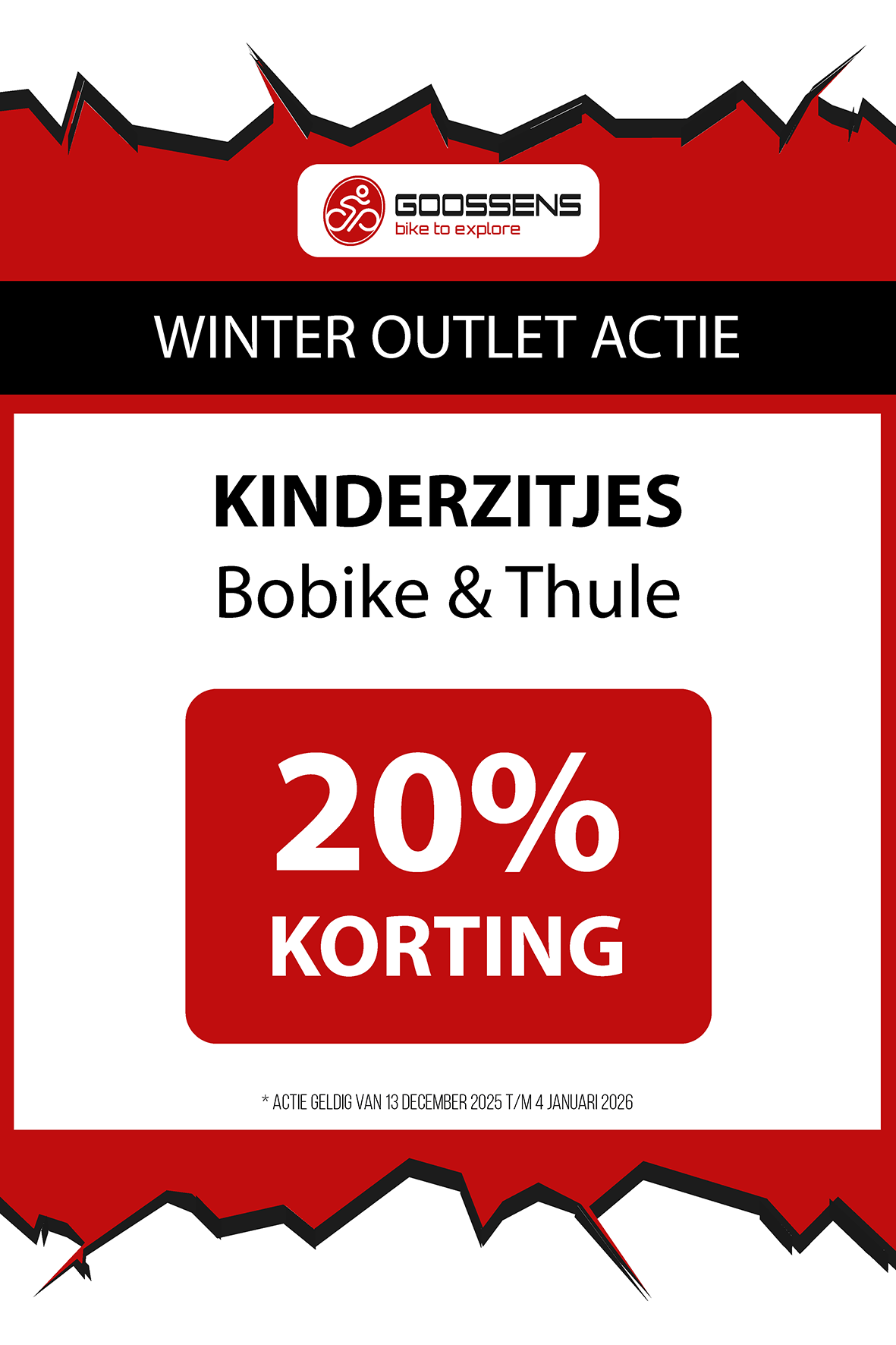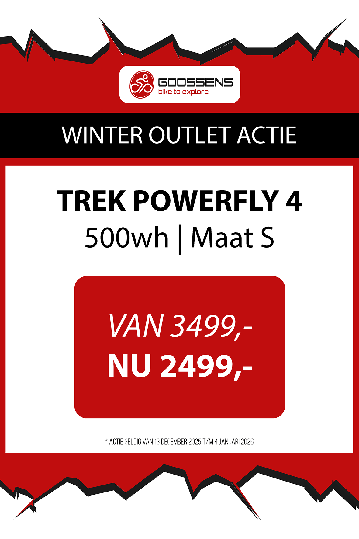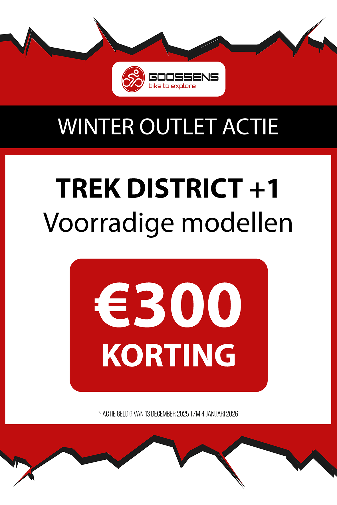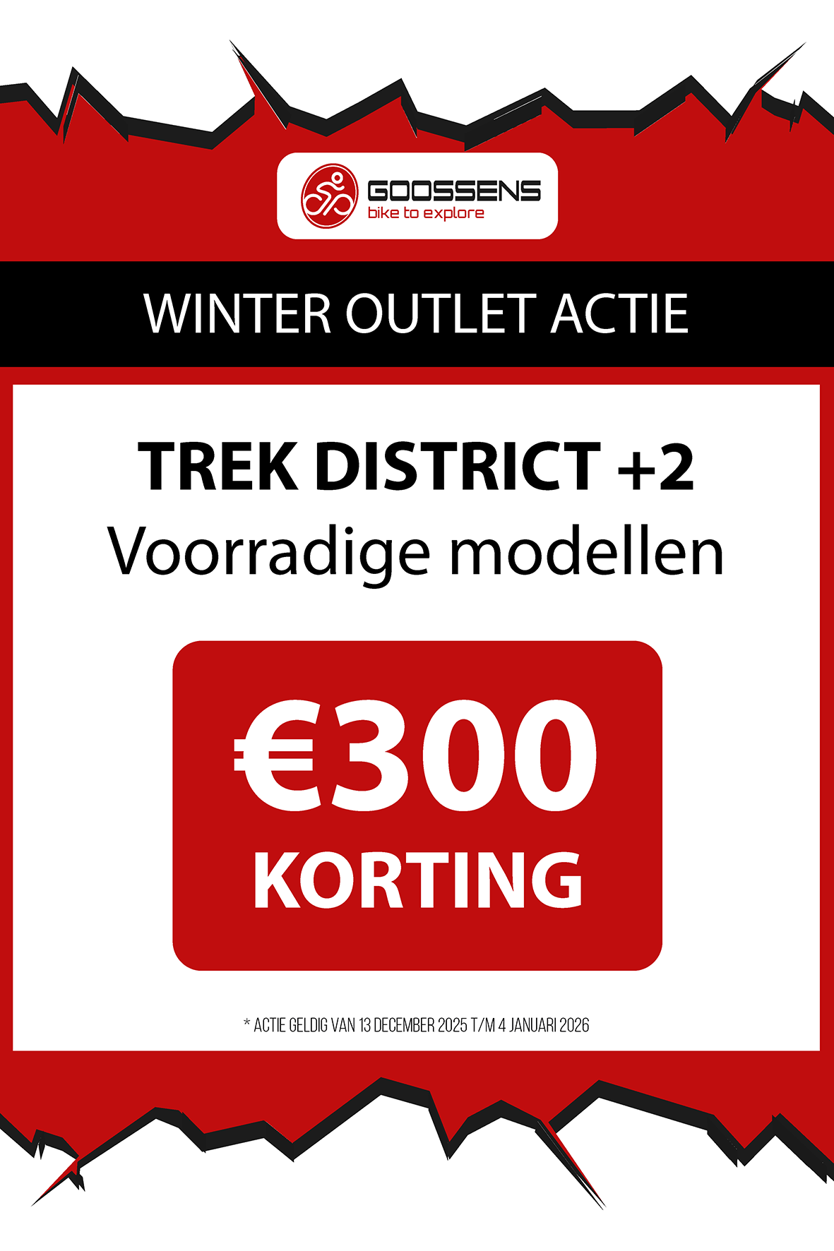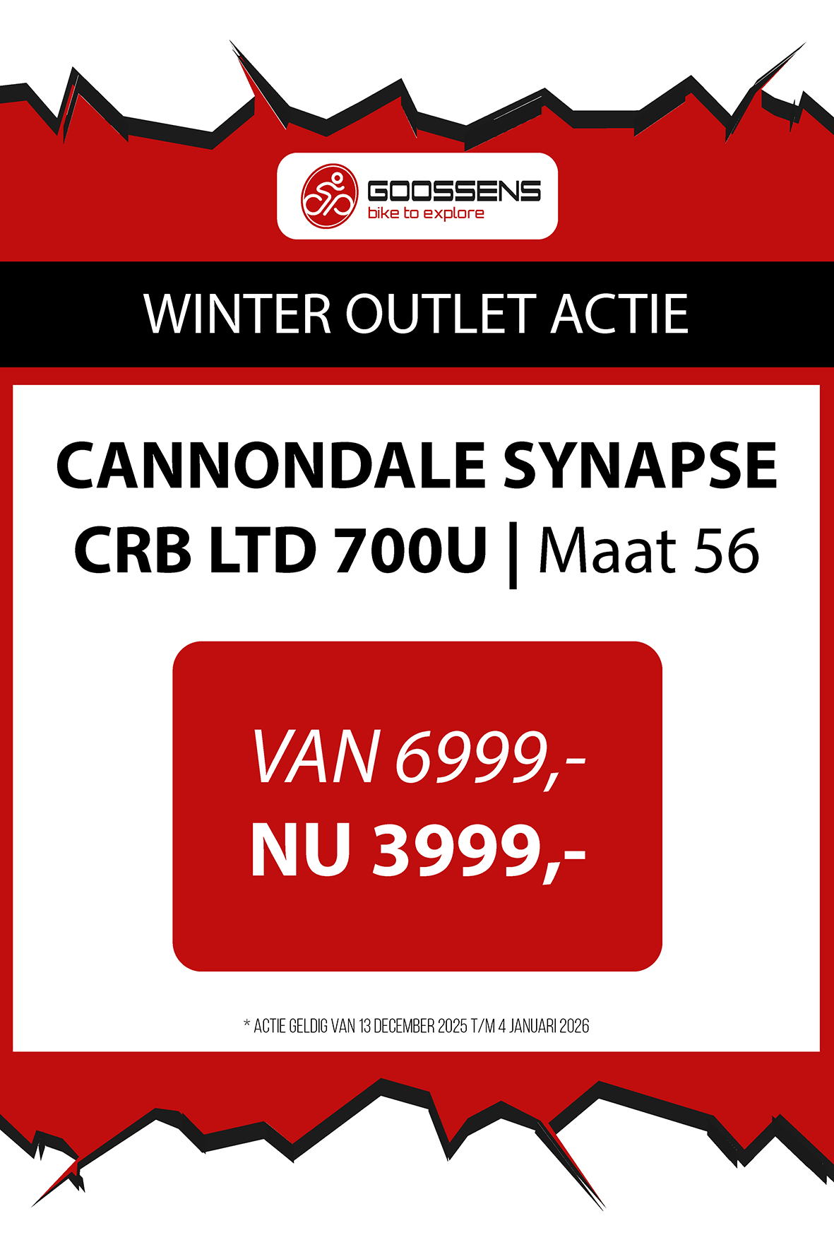 WINTER OUTLET GOOSSENS! Posted on , by in Nieuws Goed nieuws voor de fietsliefhebbers: de Winter Outlet van Goossens Lochem gaat op 13 december van start! Deze unieke verkoop biedt spectaculaire kortingen tot wel 70% op een breed assortiment fietsen, accessoires, kleding en fietsonderdelen. Of je nu op zoek bent naar een nieuwe stadsfiets, een luxe e-bike of handige accessoires, dit is hét moment om toe te slaan. Exclusieve kortingen op topmerken Tijdens de Winter Outlet kun je profiteren van scherpe aanbiedingen op bekende fietsmerken zoals Gazelle, Cube, Cannondale, Trek maar ook merken zoals Craft, Shimano, Thule, Ortlieb en nog heel veel meer! Ook voor accessoires zoals fietstassen, helmen en fietsonderdelen en kleding is de outlet de perfecte kans om je uitrusting compleet te maken voor een fractie van de prijs! Op = Op We merken dat de Winter Outlet enorm populair is. We raden iedereen aan om er snel bij te zijn, want veel items zijn beperkt, en op = echt op. Praktische informatie De Winter Outlet loopt van 13 december tot en met 14 januari. Producten die in de Winter Outlet gekochten worden, kunnen niet geruild of retour worden gebracht! Openingstijden Winter Outlet Dinsdag t/m vrijdag: 08:30 tot 18:00 Zaterdag: 09:00 tot 17:00 Zondag en maandag: Gesloten Let op: 30, 31 december 2025 en 1, 2 januari 2026 gesloten. Hou onze socials goed in de gaten, voor de gave acties! Hieronder vind je een overzicht van diverse acties! Winter Outlet Acties