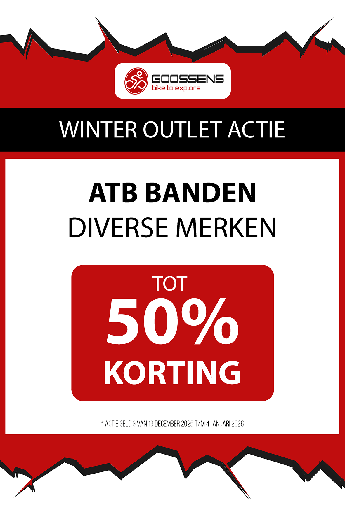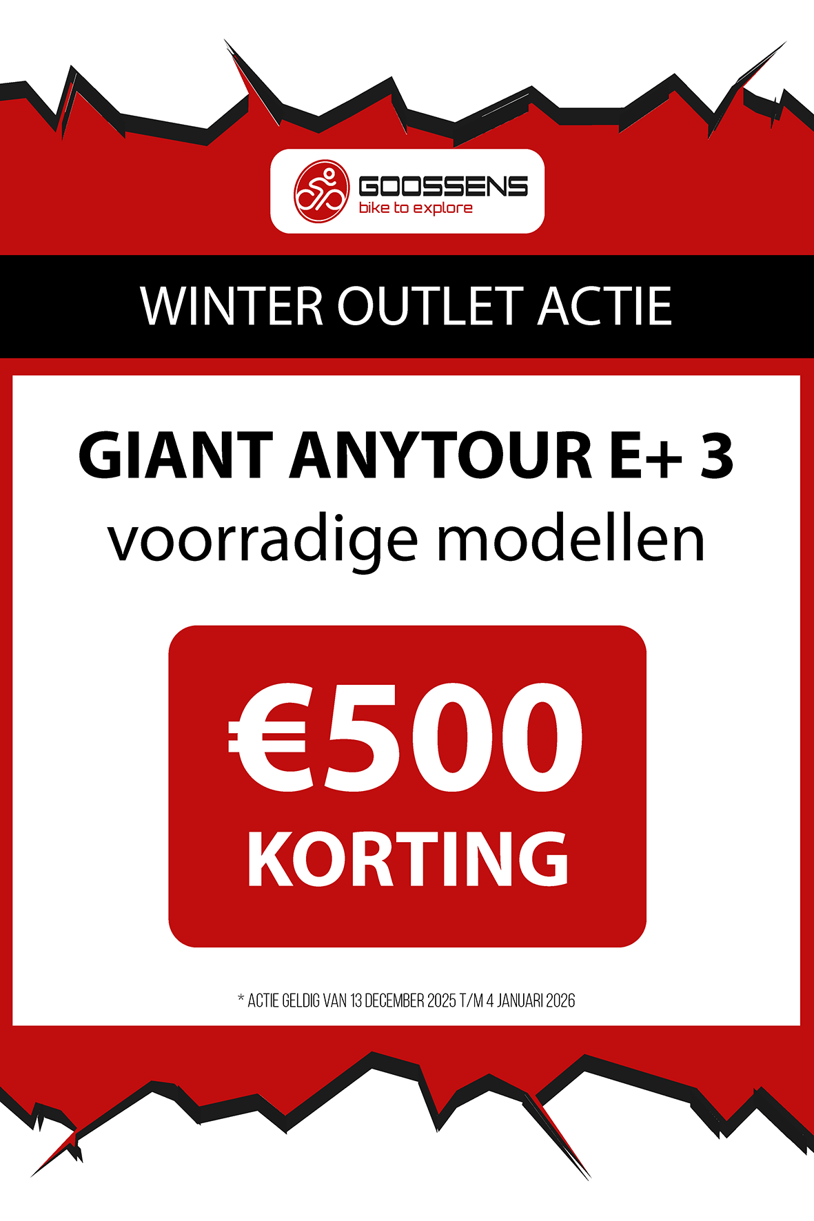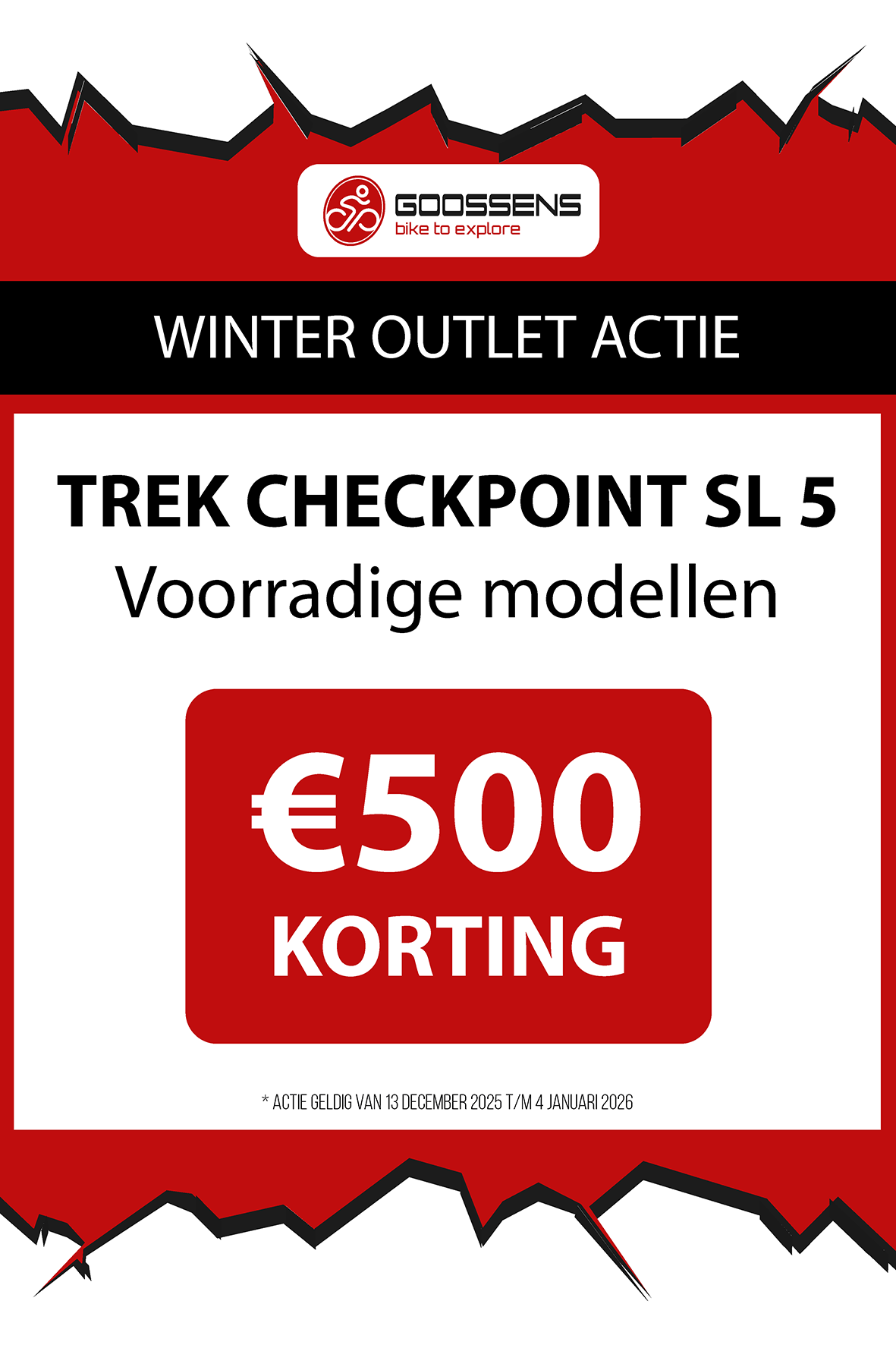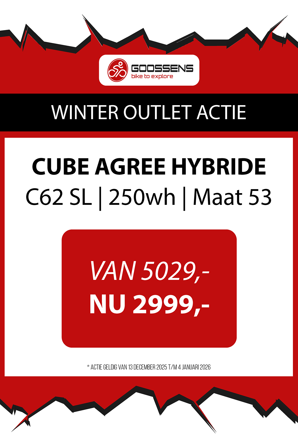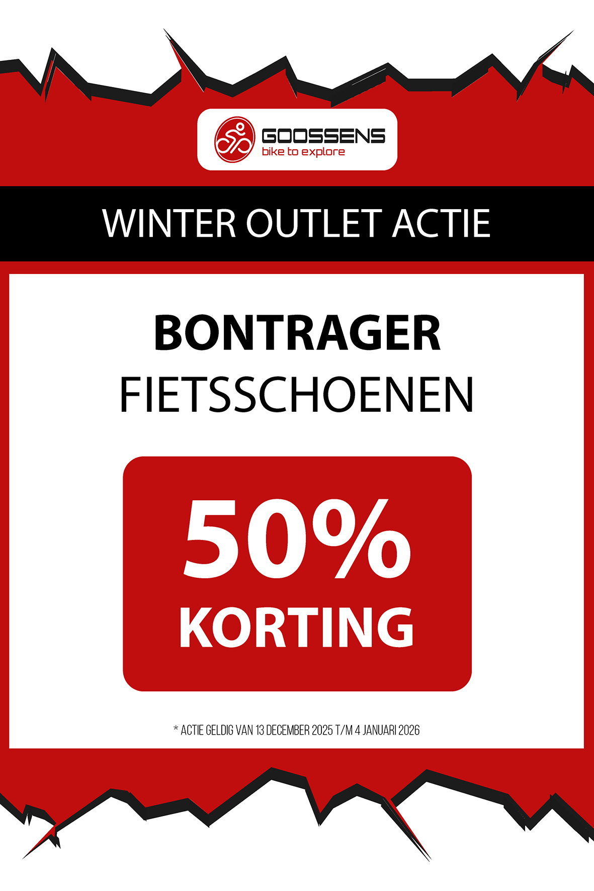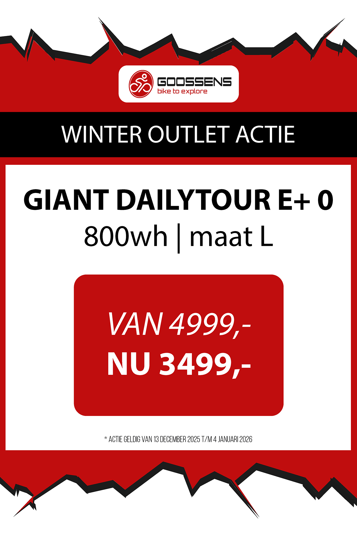 WINTER OUTLET GOOSSENS! Posted on , by in Nieuws Goed nieuws voor de fietsliefhebbers: de Winter Outlet van Goossens Lochem gaat op 13 december van start! Deze unieke verkoop biedt spectaculaire kortingen tot wel 70% op een breed assortiment fietsen, accessoires, kleding en fietsonderdelen. Of je nu op zoek bent naar een nieuwe stadsfiets, een luxe e-bike of handige accessoires, dit is hét moment om toe te slaan. Exclusieve kortingen op topmerken Tijdens de Winter Outlet kun je profiteren van scherpe aanbiedingen op bekende fietsmerken zoals Gazelle, Cube, Cannondale, Trek maar ook merken zoals Craft, Shimano, Thule, Ortlieb en nog heel veel meer! Ook voor accessoires zoals fietstassen, helmen en fietsonderdelen en kleding is de outlet de perfecte kans om je uitrusting compleet te maken voor een fractie van de prijs! Op = Op We merken dat de Winter Outlet enorm populair is. We raden iedereen aan om er snel bij te zijn, want veel items zijn beperkt, en op = echt op. Praktische informatie De Winter Outlet loopt van 13 december tot en met 14 januari. Producten die in de Winter Outlet gekochten worden, kunnen niet geruild of retour worden gebracht! Openingstijden Winter Outlet Dinsdag t/m vrijdag: 08:30 tot 18:00 Zaterdag: 09:00 tot 17:00 Zondag en maandag: Gesloten Let op: 30, 31 december 2025 en 1, 2 januari 2026 gesloten. Hou onze socials goed in de gaten, voor de gave acties! Hieronder vind je een overzicht van diverse acties! Winter Outlet Acties