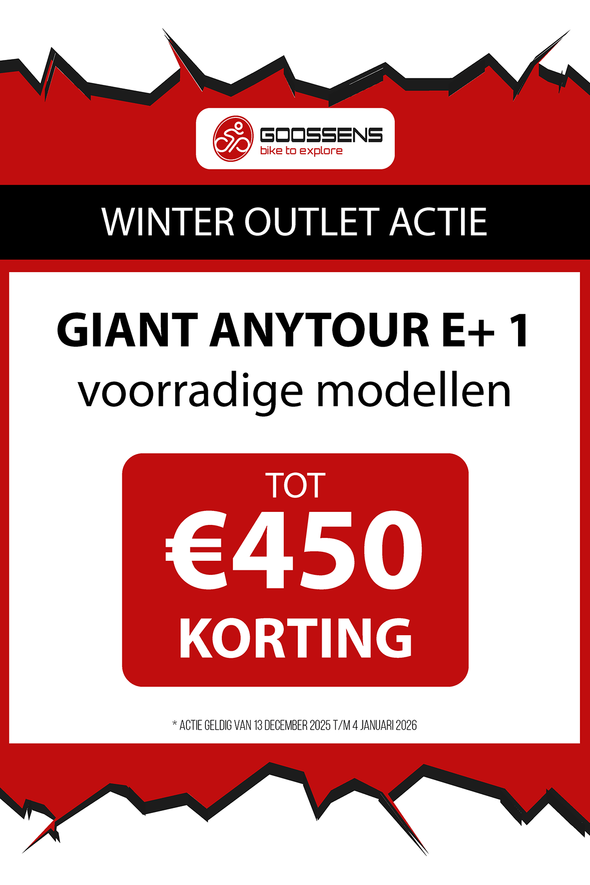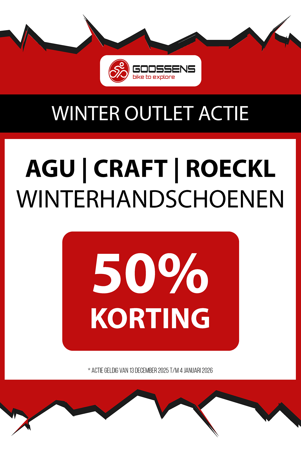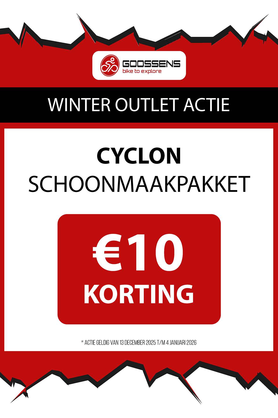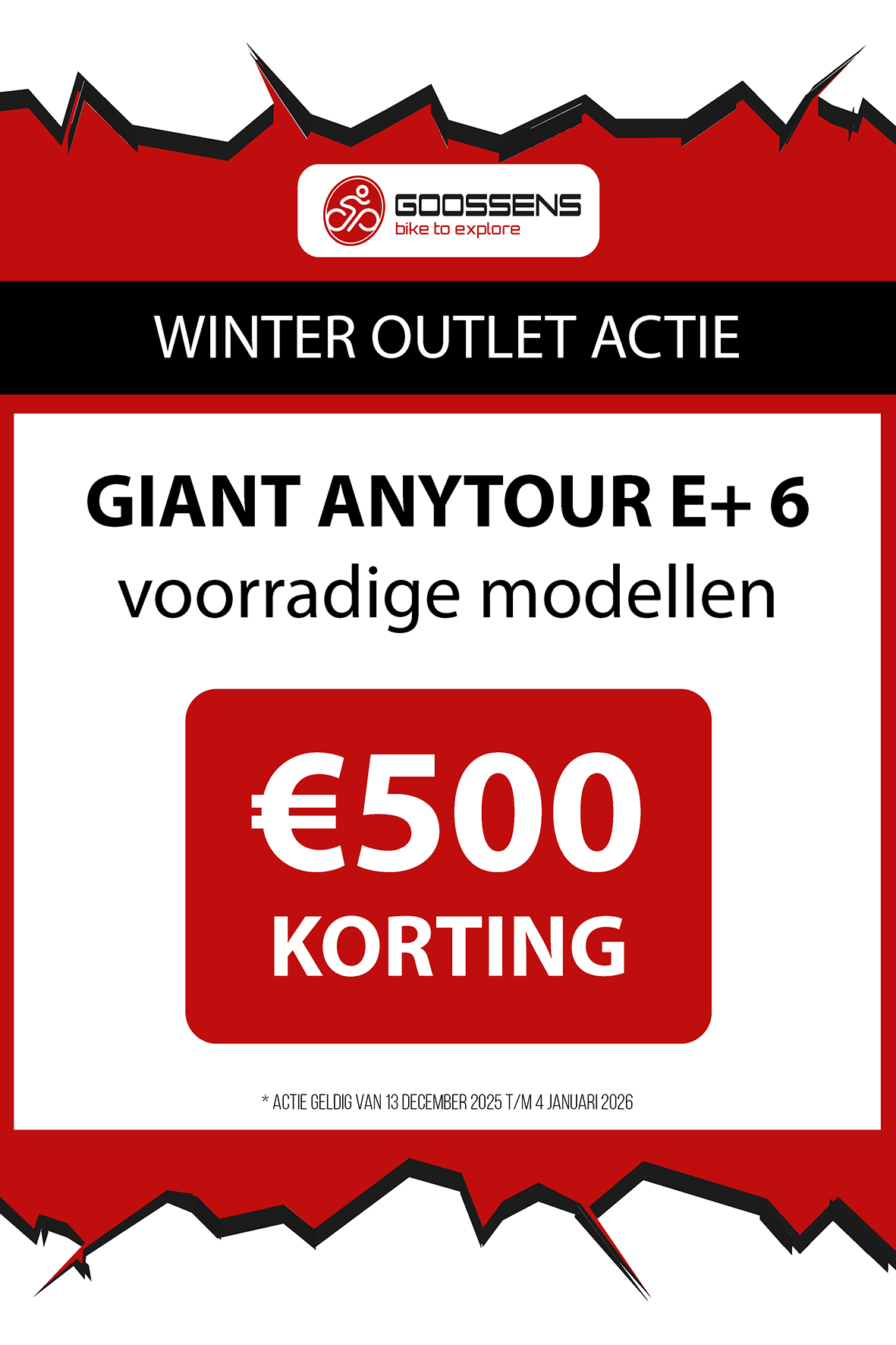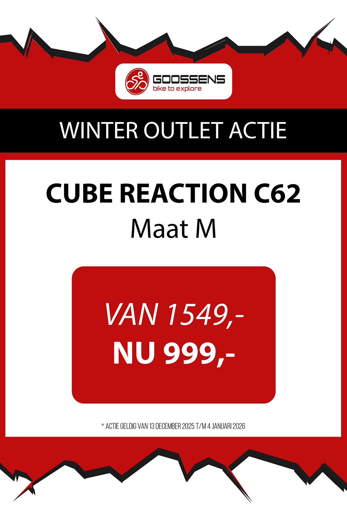 WINTER OUTLET GOOSSENS! Posted on , by in Nieuws Goed nieuws voor de fietsliefhebbers: de Winter Outlet van Goossens Lochem gaat op 13 december van start! Deze unieke verkoop biedt spectaculaire kortingen tot wel 70% op een breed assortiment fietsen, accessoires, kleding en fietsonderdelen. Of je nu op zoek bent naar een nieuwe stadsfiets, een luxe e-bike of handige accessoires, dit is hét moment om toe te slaan. Exclusieve kortingen op topmerken Tijdens de Winter Outlet kun je profiteren van scherpe aanbiedingen op bekende fietsmerken zoals Gazelle, Cube, Cannondale, Trek maar ook merken zoals Craft, Shimano, Thule, Ortlieb en nog heel veel meer! Ook voor accessoires zoals fietstassen, helmen en fietsonderdelen en kleding is de outlet de perfecte kans om je uitrusting compleet te maken voor een fractie van de prijs! Op = Op We merken dat de Winter Outlet enorm populair is. We raden iedereen aan om er snel bij te zijn, want veel items zijn beperkt, en op = echt op. Praktische informatie De Winter Outlet loopt van 13 december tot en met 14 januari. Producten die in de Winter Outlet gekochten worden, kunnen niet geruild of retour worden gebracht! Openingstijden Winter Outlet Dinsdag t/m vrijdag: 08:30 tot 18:00 Zaterdag: 09:00 tot 17:00 Zondag en maandag: Gesloten Let op: 30, 31 december 2025 en 1, 2 januari 2026 gesloten. Hou onze socials goed in de gaten, voor de gave acties! Hieronder vind je een overzicht van diverse acties! Winter Outlet Acties