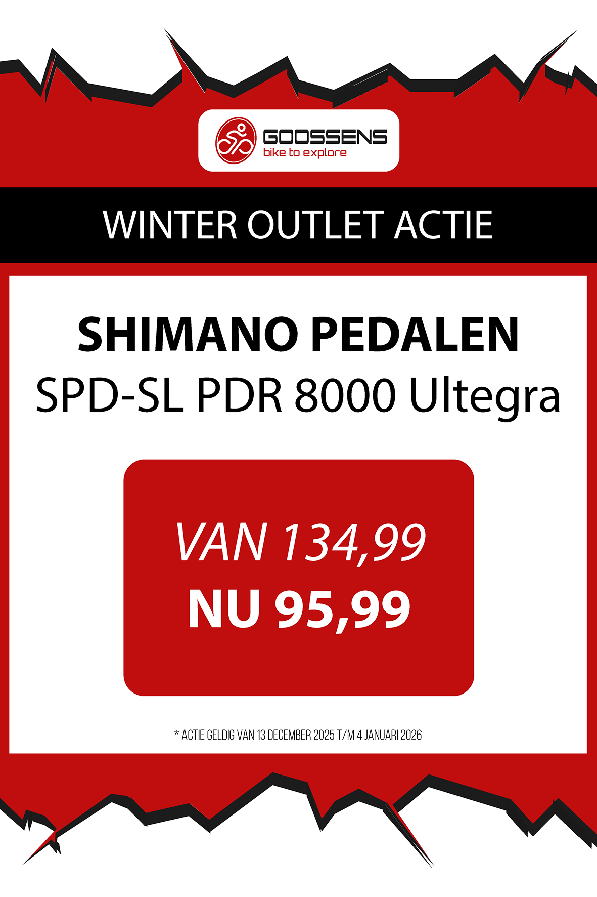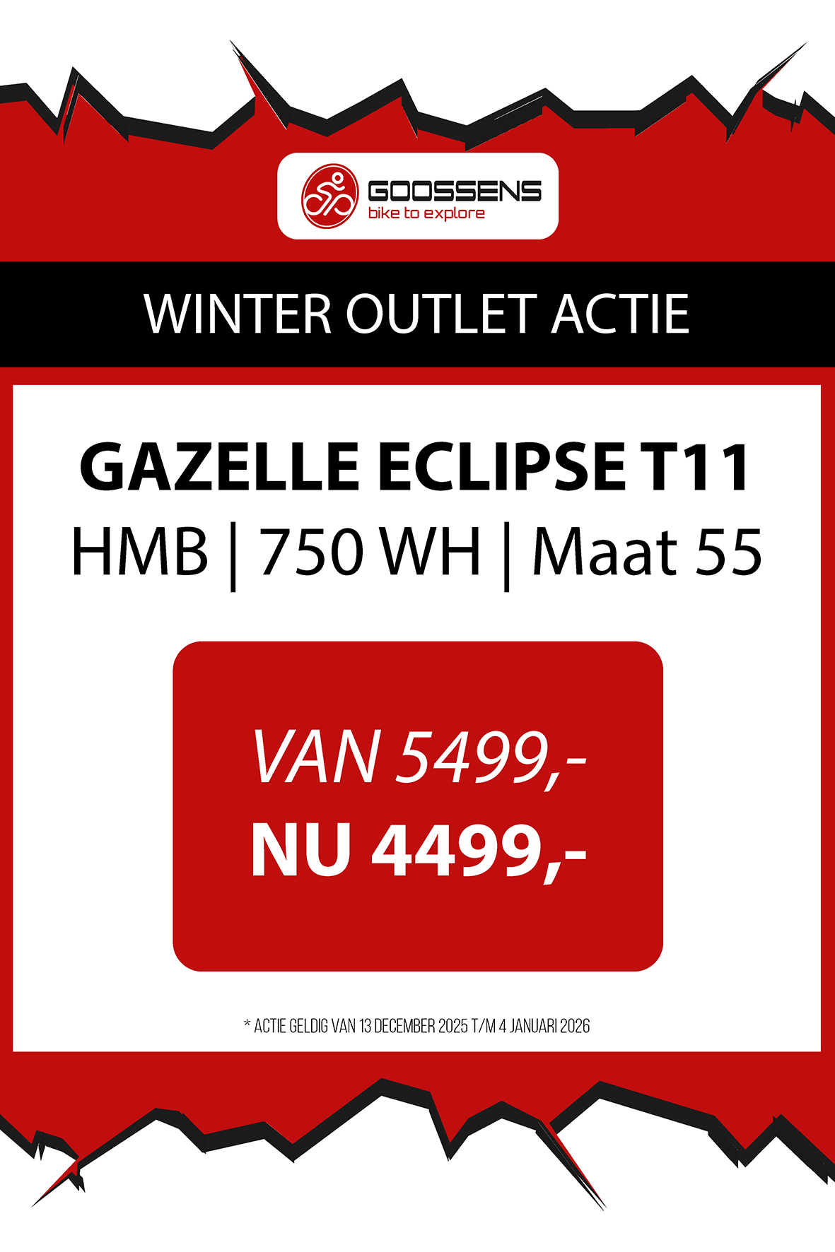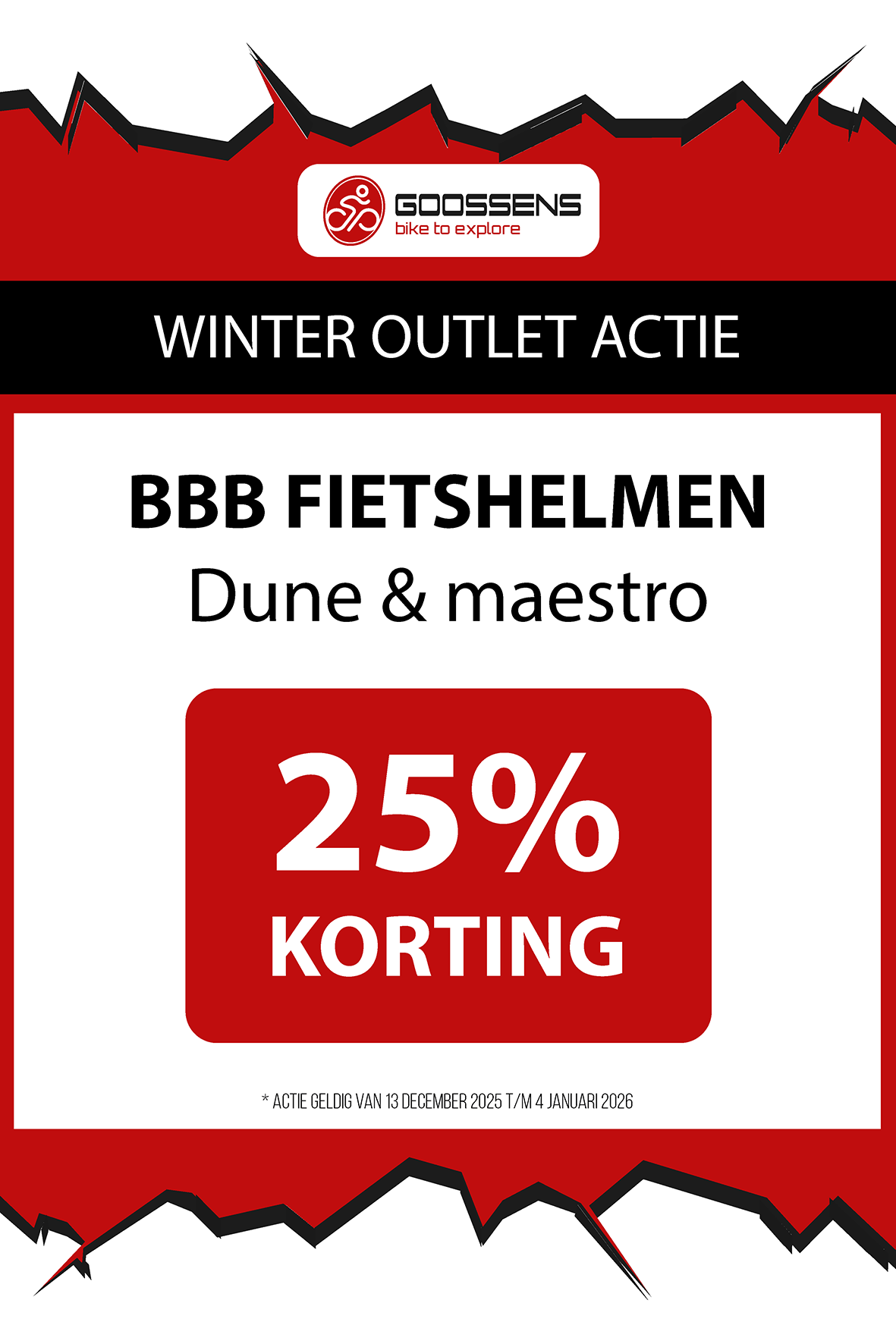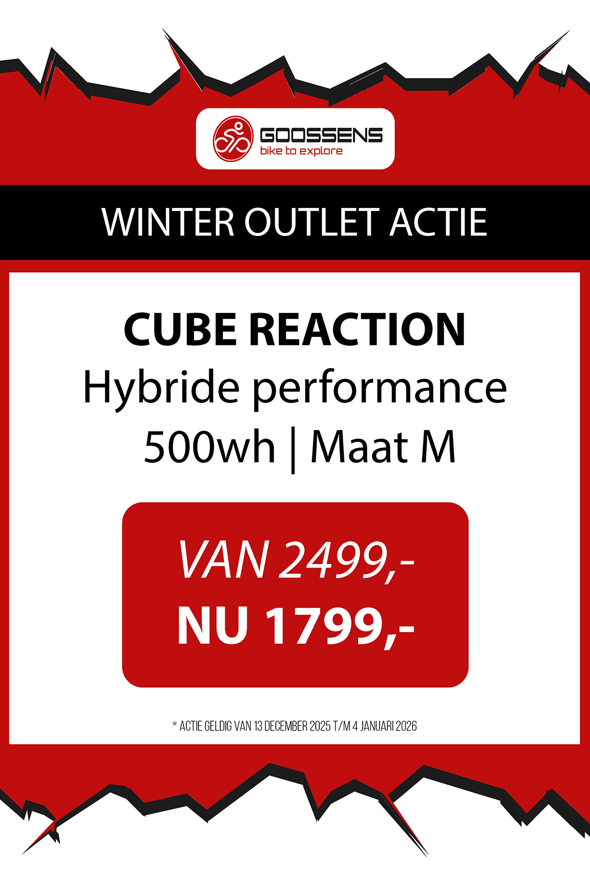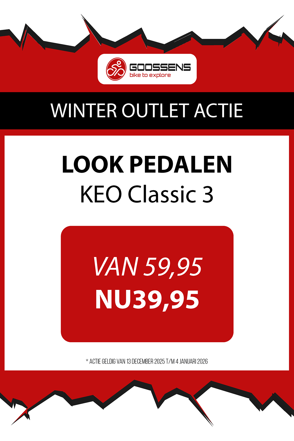 WINTER OUTLET GOOSSENS! Posted on , by in Nieuws Goed nieuws voor de fietsliefhebbers: de Winter Outlet van Goossens Lochem gaat op 13 december van start! Deze unieke verkoop biedt spectaculaire kortingen tot wel 70% op een breed assortiment fietsen, accessoires, kleding en fietsonderdelen. Of je nu op zoek bent naar een nieuwe stadsfiets, een luxe e-bike of handige accessoires, dit is hét moment om toe te slaan. Exclusieve kortingen op topmerken Tijdens de Winter Outlet kun je profiteren van scherpe aanbiedingen op bekende fietsmerken zoals Gazelle, Cube, Cannondale, Trek maar ook merken zoals Craft, Shimano, Thule, Ortlieb en nog heel veel meer! Ook voor accessoires zoals fietstassen, helmen en fietsonderdelen en kleding is de outlet de perfecte kans om je uitrusting compleet te maken voor een fractie van de prijs! Op = Op We merken dat de Winter Outlet enorm populair is. We raden iedereen aan om er snel bij te zijn, want veel items zijn beperkt, en op = echt op. Praktische informatie De Winter Outlet loopt van 13 december tot en met 14 januari. Producten die in de Winter Outlet gekochten worden, kunnen niet geruild of retour worden gebracht! Openingstijden Winter Outlet Dinsdag t/m vrijdag: 08:30 tot 18:00 Zaterdag: 09:00 tot 17:00 Zondag en maandag: Gesloten Let op: 30, 31 december 2025 en 1, 2 januari 2026 gesloten. Hou onze socials goed in de gaten, voor de gave acties! Hieronder vind je een overzicht van diverse acties! Winter Outlet Acties
