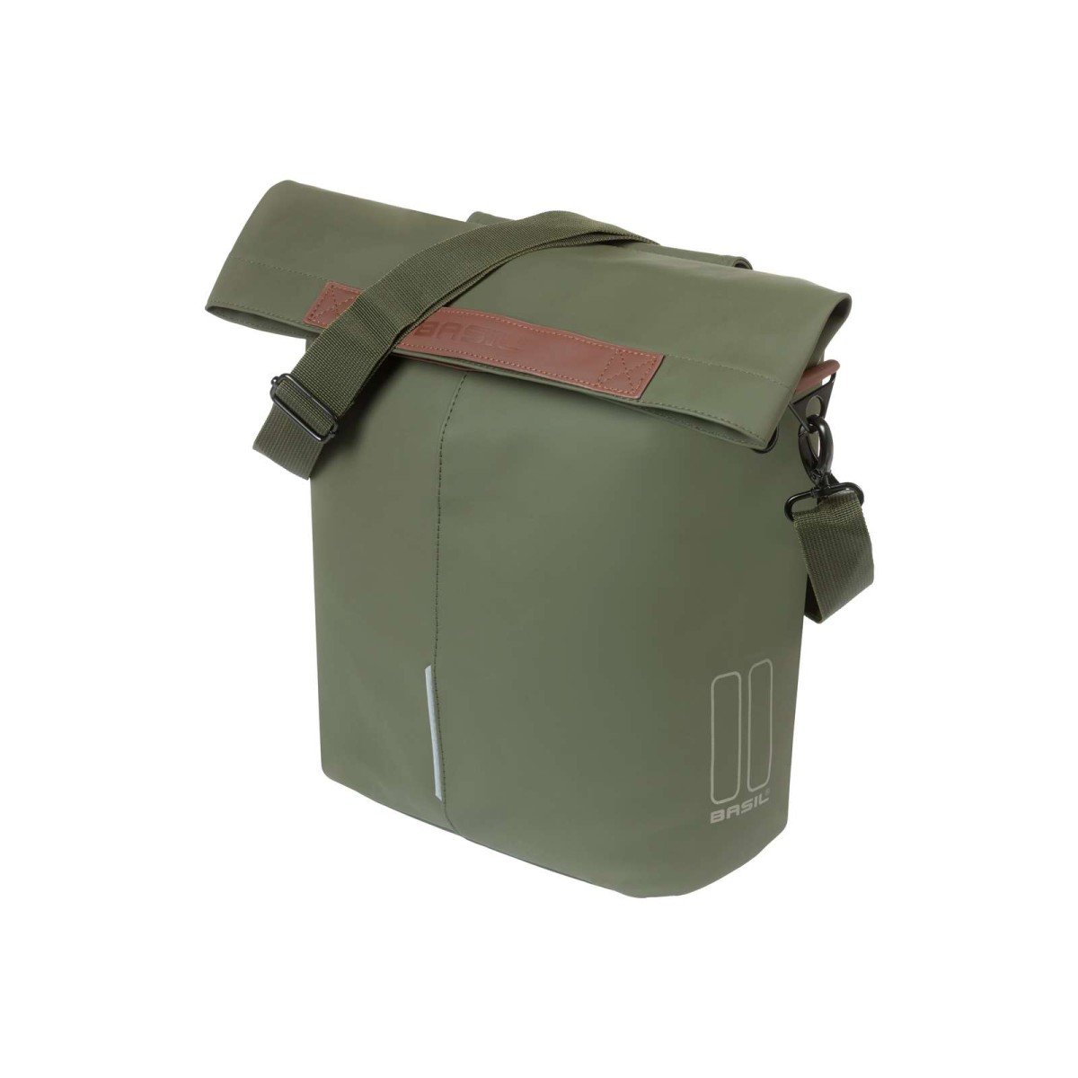 Basil City fietsshopper, vegan leather, waterkerende vouwsluiting met magneet, inclusief afneembare schouderband, handgrepen, binnenvak met rits, bevestigingsmogelijkheid LED batterijverlichting, Basil Hook-On systeem, reflectie, 14-16L, moss green
