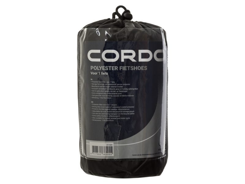Stevige CORDO fietshoes, geschikt voor 1 fiets. De hoes heeft een afmeting van 110 x 70 x 200 CM en is gemaakt van waterafstotend polyester. De hoes is voorzien van een koord rondom de zoom om de hoes stevig om de fiets heen te trekken zodat deze goed blijft zitten. Daarbij zijn er aan de onderkant van de hoes handige metalen ringen aangebracht, waar een extra touw doorheen gespannen kan worden. Voor extra veiligheid is een reflecterende print aangebracht.