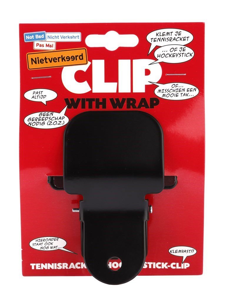 Niet Verkeerd tennis/hockeyclip 2.0 zwart op kaart, bevestigen met Tie-rips/kabelbinders om je vork of frame, universeel te gebruiken door de unieke vormgeving